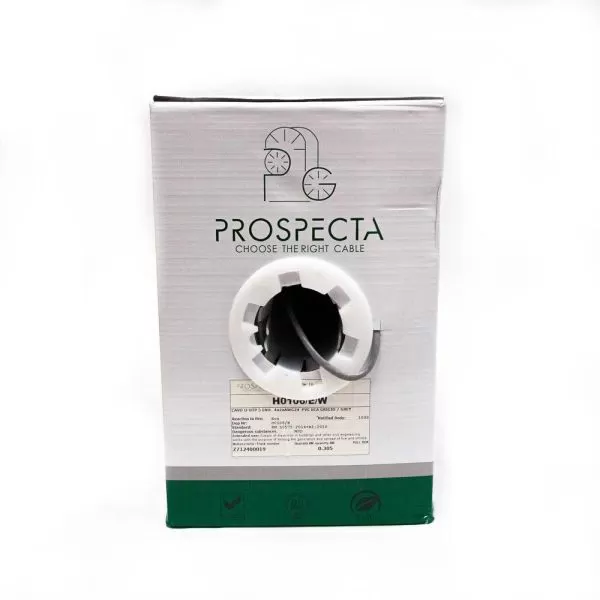 Cablu UTP CAT 5E 4x2xAWG24, cupru 100%, cod: H0106/E/W, pentru retelistica (pana la 100MHz), numar perechi: 4 twisted, diametrul conductorului: 0.51mm, material PVC, culoare gri, diametru exterior 4.7mm, Conductor Loop Resistance Ohm/km: 178, Mutual Capacity C1 pF/m: 49, Velocity Ratio 69%, Voltage Rating Uo/U 500 volt, Insulation Resistance MOhm / km: >20, raza de curbura: 10x diametru, standarde: ANSI/TIA/EIA 568 ISO/IEC 11801, EN 50575, Euroclass Eca, cutie 305 metri, greutate 29kg/km.