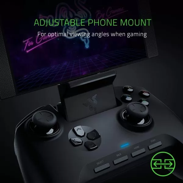 Gaming Controller Razer Raiju Mobile, Wireless and wired control, Mobile app for Android, Adjustable phone mount, 4 individually remappable multi-function buttons, Up to 23 hours battery life on a single charge, Android mobile device with Bluetooth compatibility, Approximate size: 125 mm / 4.92 in (Length) x 159.4 mm / 6.27 in (Width) x 66 mm / 2.60 in (Height), Approximate weight (without cable): 306 g / 0.67 lbs.