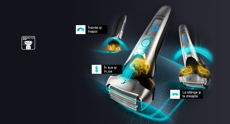 Tehnologia inovatoare pentru capul pentru barbierit 3D de la Panasonic se adapteaza perfect conturului fetei. Capul pentru barbierit ultraflexibil se deplaseaza in sase directii: inainte si inapoi, de la stanga la dreapta, precum si in sus si in jos. Ajustarea perfecta a conturului previne presiunea inutila si va ofera intotdeauna un barbierit complet, exact si bland.