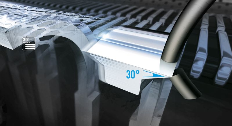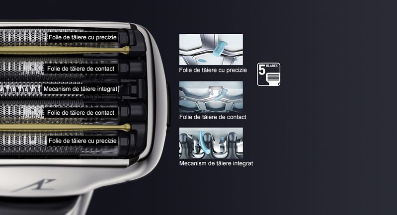 Interactiunea celor trei structuri cu pelicula prinde si taie rapid, complet si atent cele mai dificile puncte ale barbii si firele de par cu diverse directii de crestere. Pentru un barbierit extrem de neted, mecanismul de taiere integrat taie firele de par lungi, folia de taiere de contact taie firele de par ramase, iar folia de taiere cu precizie taie firele de par rebele.