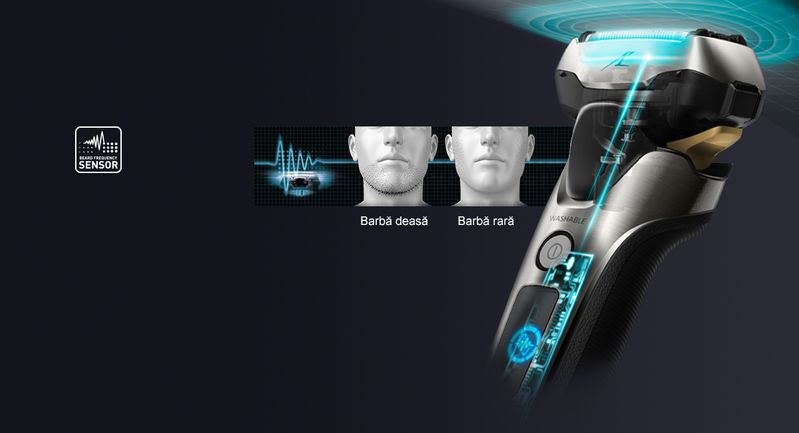 Senzorul pentru desimea barbii detecteaza in orice moment desimea firelor de par din barba sau daca o zona este barbierita deja. Prin aceasta, aparatul de ras Panasonic adapteaza vibratiile lamei in timp real: nivel de inalta performanta in cazul barbilor dese, nivel redus in punctele barbierite deja. Efectul: Se evita iritatiile inutile ale pielii.