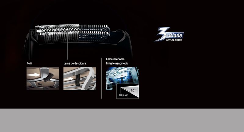 Trei lame scurteaza favoritii si taie mai aproape de radacina pentru un barbierit fin. Indeplinind doua functii diferite, lamele asigura un barbierit rapid si complet. Un barbierit incredibil de fin este asigurat si mai mult de lamele interioare finisate nanometric, ascutite la 30°.