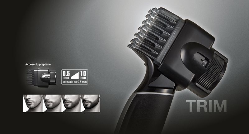 Accesoriu pieptene pentru o barba de lungime egala Utilizarea accesoriilor cu functie de ajustare a lungimii permite o tundere perfecta si usoara la lungimea dorita. |