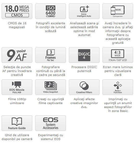 | Accesorii incluse | Obiectiv Canon EF-S 18-55 mm f/3.5-5.6 IS |