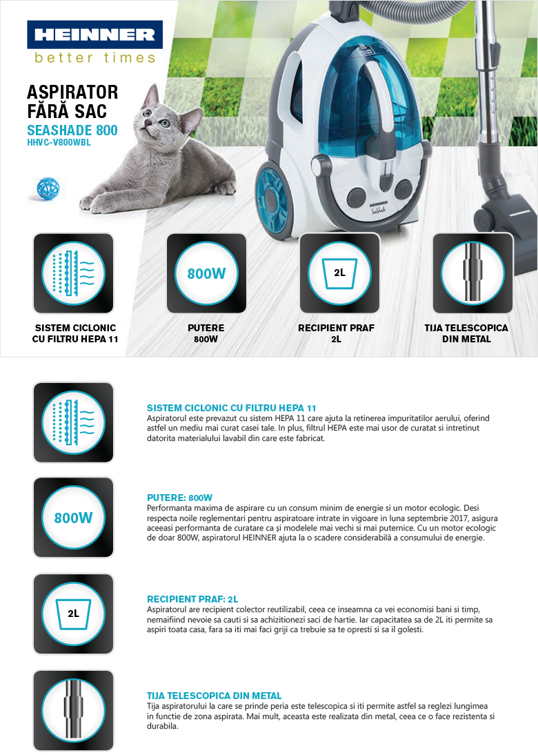 | Caracteristici Aspirator fara sac Heinner HVC-V800WBL, putere de aspirare 180W, Alb/Albastru: | |