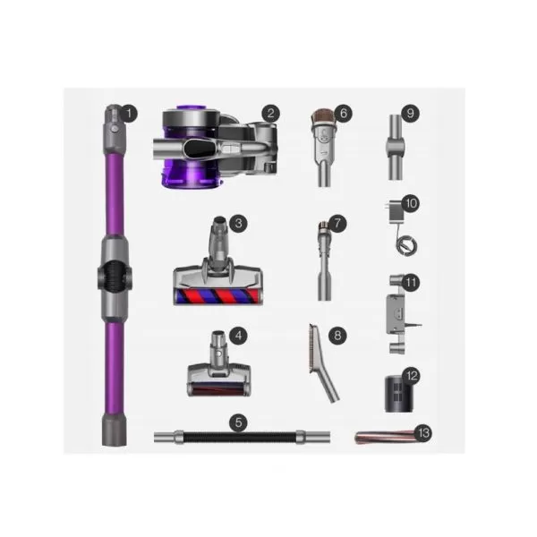 | Accesorii | Tub flexibil Aspirator de mana Perie electrica de podea Perie electrica de aspirare a saltelelor Furtun extensibil Peria 2 in 1 pentru tapiterie Peria 2 in 1 pentru spatii inguste Perie moale Conector Incarcator Suport incarcator Perie pentru carpete |