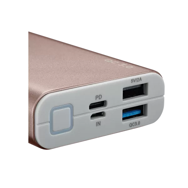 Power bank 10000mAh, quick charge QC3.0, bulit in Lithium Polymer Battery, Rose Gold. Micro Input: 5V/2A, 9V/2A, PD Input/Output: 5V/2A, 9V/2A, Output1: 5V/2A, Output2: 18W (QC3.0).