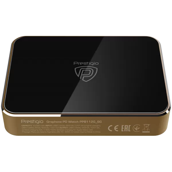 Prestigio Graphene PD Watch Edition, fast charging powerbank, 10000 mAh, 2*USB3.0 QC, 1*Type-C PD, wireless charger 10W, Apple Watch wireless charger 2,5W, LED indicator, leather case, cable type C-USB, 60W adapter, aluminium and tempered glass, black+gold color