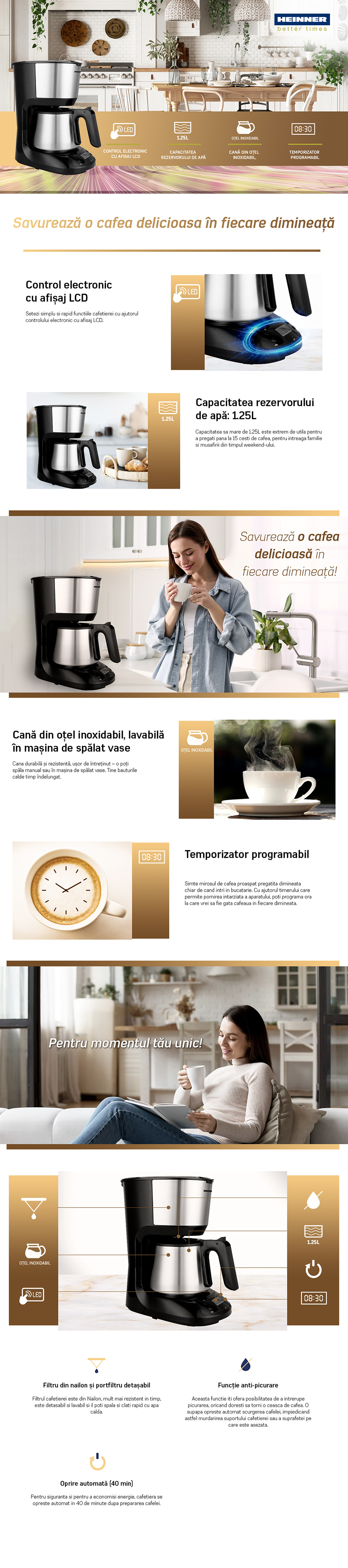 | Caracteristici Cafetiera Digitala Heinner Armoure HCM-D750SSBK, 1.25L, 750W: | |