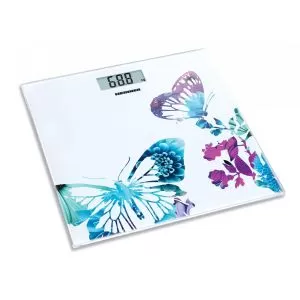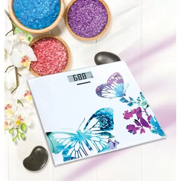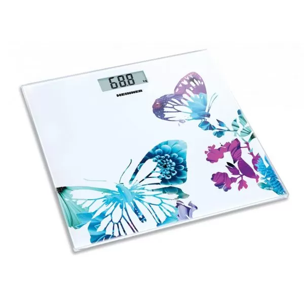 Cantar de baie Heinner Butterfly 150 HBS-150BTF, platforma din sticla securizata de 6 mm, capacitate maxima: 150kg, display LCD, gradare: 100g, pornire / orpire automata, indicator baterie descarcata, indicator depasire greutate, baterie inclusa: 1 x CR2032 Li
