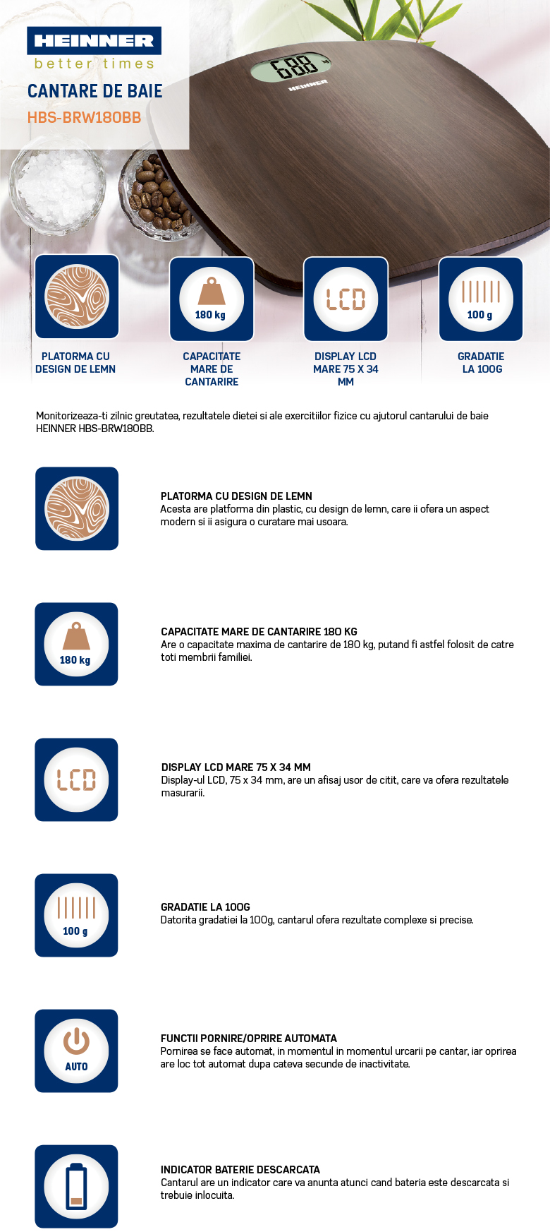 | Caracteristici Cantar de baie Heinner HBS-BRW180BB, greutate maxima 180kg: | |