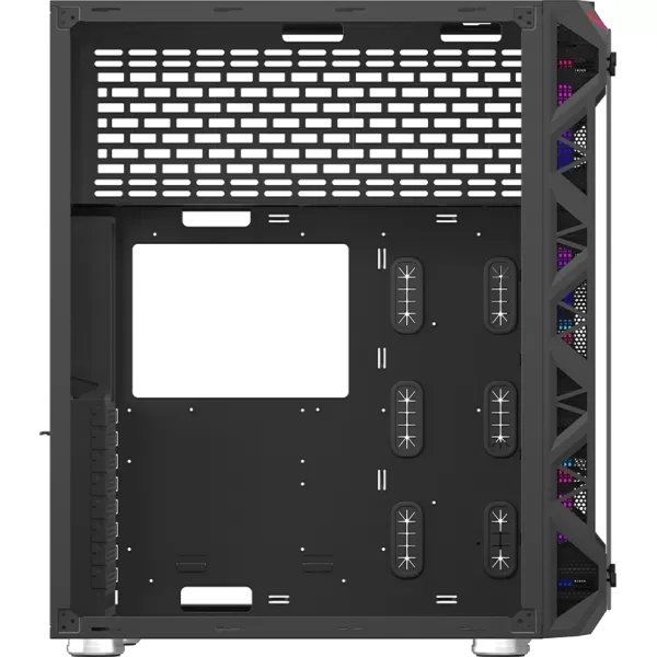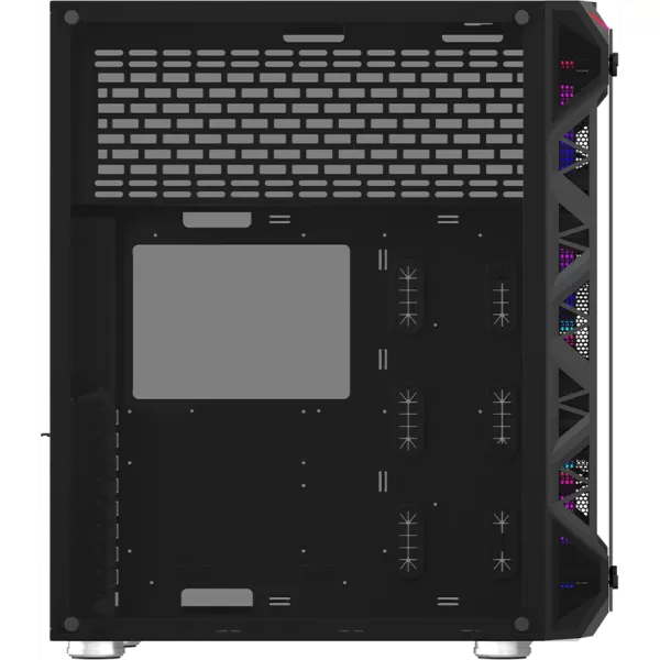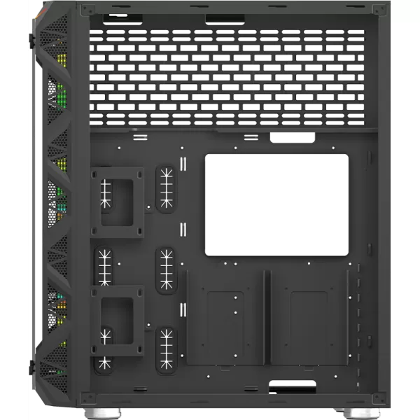 • interior full-black cu sectiuni separate pentru instalarea componentelor: placa de baza si placi de extensie, unitati de stocare, sursa de alimentare