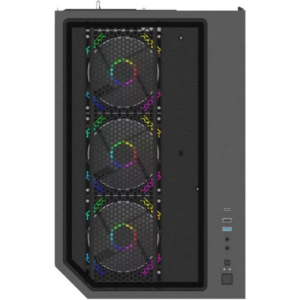 • 6 ventilatoare cu pale inversate pentru introducerea aerului in carcasa si pastrarea vizibilitatii efectelor "<strong>Infinity Mirror"</strong> (iluminate ARGB - model 6P-12DLRB16B-ARGB) <br />
