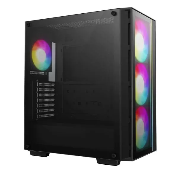 Carcasa Deepcool Matrexx 55 V4 aRGB neagra, ABS+SPCC+Tempered Glass Middle Tower fara sursa (tip ATX, montata jos), interior vopsit negru, 2x3,5” (intern), 2+1x2,5” (intern), spate – 1x120mm aRG LED fan (inclus), fata – 3x140mm aRGB LED fans (inclus) / 3x 120mm fan (optional) , tavan – 2x 120/140mm fans (optional), podea – 2x 120mm fan (optional), 1x USB 3.0, 1x USB Type-C, HD Audio,panou lateral si frontal din sticla securizata, panou frontal iluminat aRGB, sloturi expansiune: x7, ATX / microATX / Mini-ITX, inaltime maxima cooler procesor: 165mm, lungime maxima placa video: 370mm, suport radiatoare water cooling: tavan – 1x 120/140/240/280mm, spate – 1x 120mm, fata – 1x 120/140/240/280/360mm, dimensiuni (LxWxH): 421 x 215 x 483mm, greutate: 6.9 kg