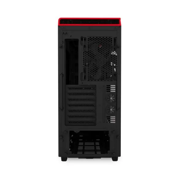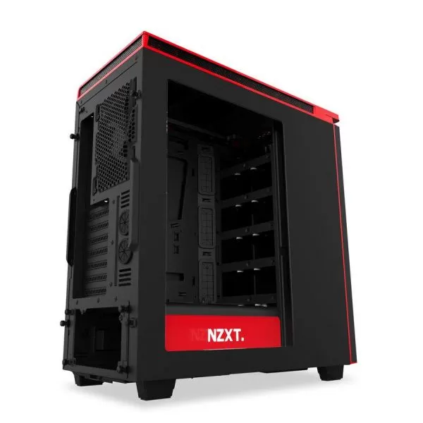 NZXT H440 New Edition Matte Black/Red, SECC Steel ATX Mid Tower, fara sursa, captusita cu material fonoabsorbant, interior vopsit negru, 11x3.5” (intern), 8x2.5” (intern), design tool-less, fata – 3x 120mm fans (inclus) sau 2x 140mm fans (optional), spate – 1x 140mm fan (inclus) sau 1x 120mm fan (optional), tavan – 2x 140mm fans (optional) sau 3x 120mm fans (optional), 2x USB 3.0, 2x USB 2.0, 1x Audio/Mic, 1x control lumini, fan hub PWM pentru 8 ventilatoare, ATX / microATX / Mini-ITX, sloturi expansiune: x7, inaltime maxima cooler procesor: 180mm, lungime maxima placa video: 294mm (cu cusca hard disk montata) sau 428mm (fara cusca hard disk montata), suport radiatoare water cooling: fata – 2x 140mm sau 3x 120mm, tavan – 2x 140mm sau 3x 120mm, spate – 1x 140/120mm, filtre de praf incluse, dimensiuni: 220 x 512 x 480mm, greutate: 10.16kg