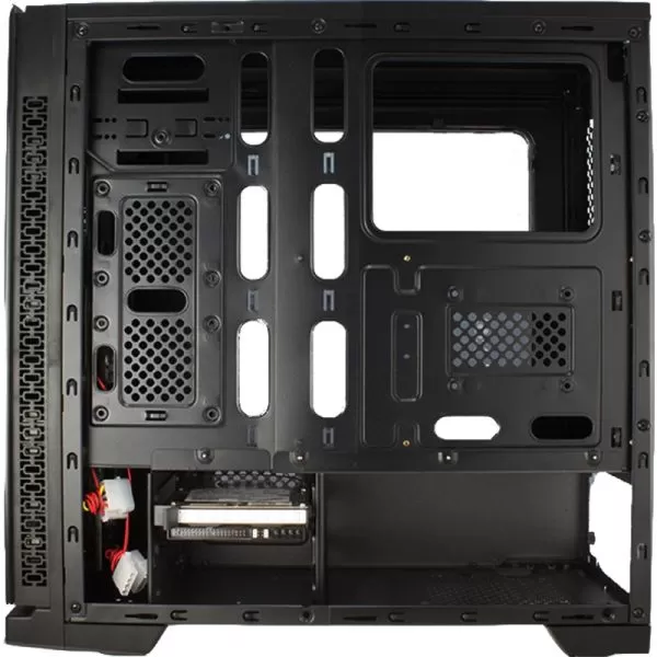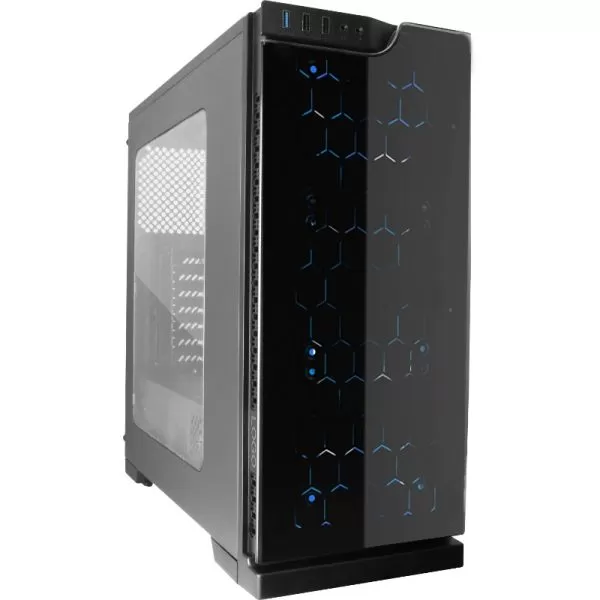 Segotep SG-K5 Black, SECC Steel ATX Mid Tower, fara sursa (tip ATX, montata jos), interior vopsit negru, 2x3.5” (intern), 3x2.5” (intern), design tool-less, fata – 2x 120mm Polar Wind Blue LED fans (inclus) si 1x 120mm fan (optional), spate – 1x 120mm Blue LED fan (inclus), intern – 1x 120mm fan (optional), tavan – 1x 120mm fan (optional), design premium cu panou panou frontal din sticla securizata, 1x USB 3.0, 2x USB 2.0, HD Audio, ATX / microATX / Mini-ITX, sloturi expansiune: x7, inaltime maxima cooler procesor: 155mm, lungime maxima placa video: 370mm