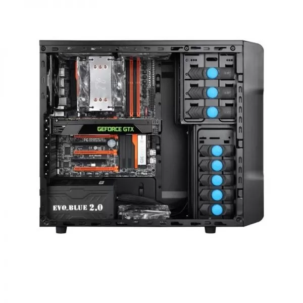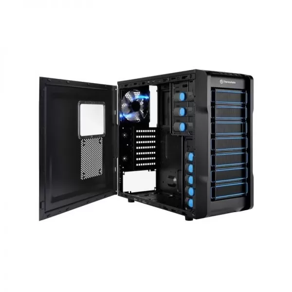 Thermaltake Chaser A21, SECC Steel ATX Mid Tower, fara sursa, interior vopsit in negru, 3x5.25” (extern), 1x3.5” (extern, convertibil dintr-un bay de 5.25”), 6x3.5” (intern), 1x2.5” (intern), design tool-less, fata – 1x 120mm fan (optional), spate – 1x 120mm Blue LED fan (1000 RPM, 16 dBA, inclus), podea – 1x 120mm fan (optional), tavan – 2x 120mm fans (optional), lateral – 1x 120mm fan (optional), 1x USB 3.0, 1x USB 2.0, HD Audio, ATX / microATX, filtre de praf incluse, dimensiuni: 427 x 195 x 497 mm, greutate: 5.2 kg