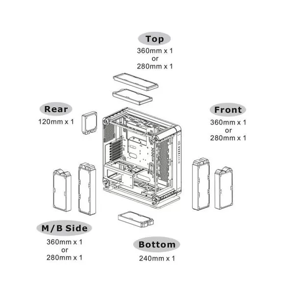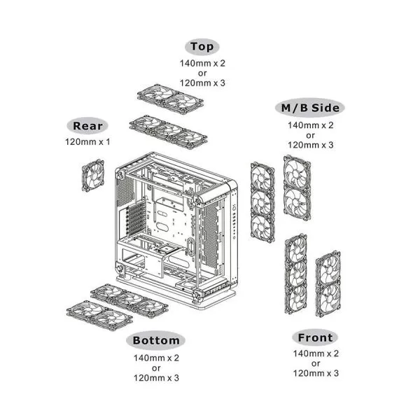 | Ventilatoare optionale | Fata: 3 x 120mm sau 2 x 120mm Tavan: 3 x 120mm sau 2 x 140mm Spate: 1 x 120mm Podea: 3 x 120mm sau 2 x 140mm |