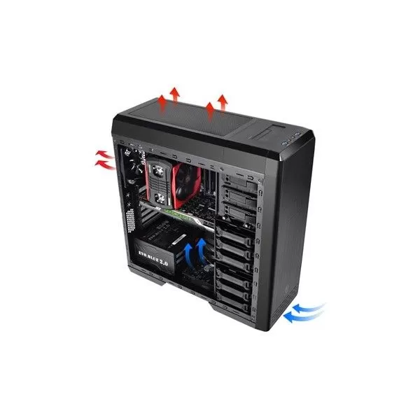 Thermaltake Urban R31 Window, SECC Steel ATX Mid Tower, fara sursa, interior vopsit negru, 3x5.25” (extern), 1x3.5” (extern, convertibil dintr-un bay de 5.25”), 6x3.5”/2.5” (intern), 1x3.5”/2.5” (HDD Docking Station), design tool-less, fata – 1x 120mm Turbo fan (1000 RPM, 16 dBA, inclus) si 1x 120mm fan (optional), spate – 1x 120mm Turbo fan (1000 RPM, 16 dBA, inclus), podea – 1x 120mm fan (optional), tavan – 2x 140/120mm fans (optional), 2x USB 3.0, HD Audio, sloturi expansiune: x7, ATX / microATX, inaltime maxima cooler procesor: 155mm, lungime maxima placa video: 290mm (cu rack HDD) sau 410mm (fara rack HDD), suport radiatoare water cooling: tavan - 1 x 120mm sau 2 x 120mm, filtre de praf incluse, dimensiuni: 511 x 206 x 490 mm, greutate: 7 kg