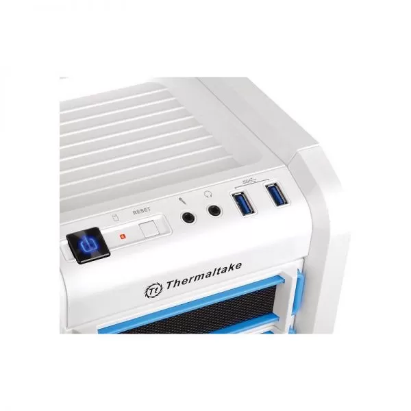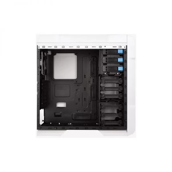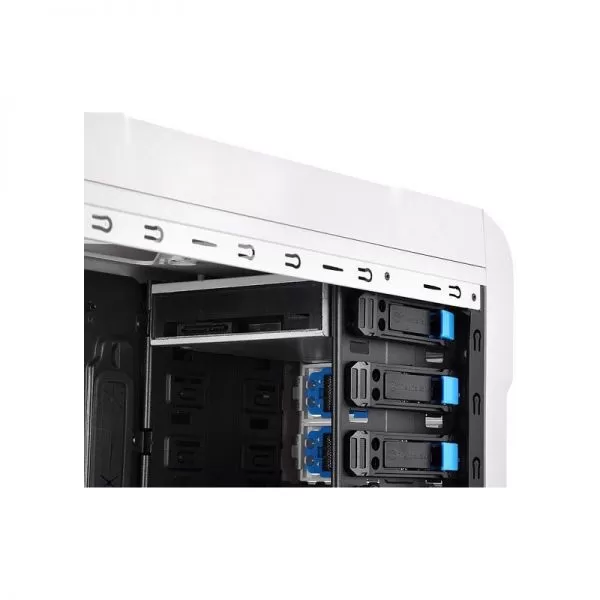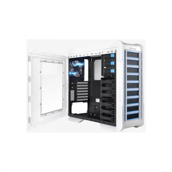 Thermaltake Chaser A31 Snow Edition White, SECC Steel ATX Mid Tower, fara sursa, interior vopsit in negru, 3x5.25” (extern), 1x3.5” (extern, convertibil dintr-un bay de 5.25”), 6x3.5”/2.5” (intern), design tool-less, fata – 1x 120mm Turbo fan (1000 RPM, 16 dBA, inclus) si 1x 120mm fan (optional), spate – 1x 120mm Blue LED fan (1000 RPM, 16 dBA, inclus), podea – 1x 120mm fan (optional), tavan – 2x 140/120mm fans (optional), 2x USB 3.0, HD Audio, sloturi expansiune: x7, ATX / microATX, dimensiuni: 501 x 212 x 495mm, greutate: 6.5 kg