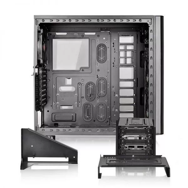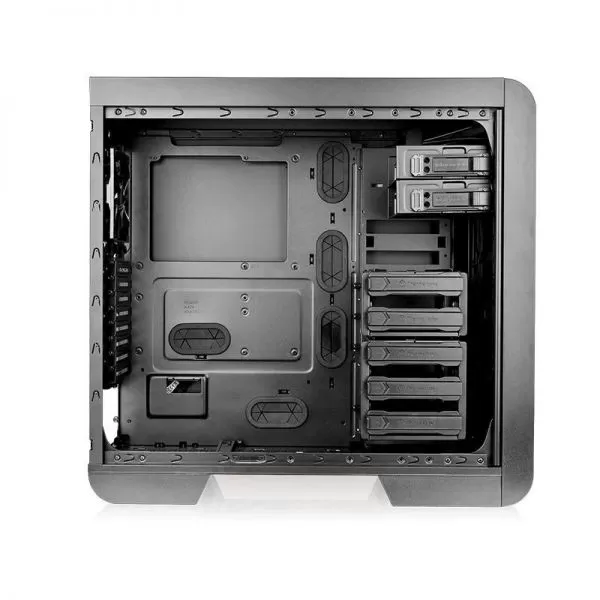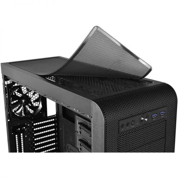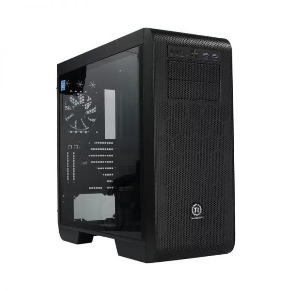 Thermaltake Core V51 Tempered Glass, SPCC Steel EATX Mid Tower, fara sursa, interior vopsit in negru, 2x5.25” (extern), 5x3.5”/2.5” (intern), design tool-less, fata – 2x 120mm Turbo fans (1000 RPM, 16 dBA, inclus) si 1x 120mm fan (optional) sau 2x 140mm fans (optional) sau 1x 200mm fan (optional), spate – 1x 120mm Turbo fan (1000 RPM, 16 dBA, inclus) sau 1x 140mm fan (optional), podea – 2x 120mm fans (optional), tavan – 2x 200mm sau 3x 140mm sau 3x 120mm fans (optional), 2x USB 3.0, HD Audio, sloturi expansiune: x8, EATX / ATX / microATX / Mini-ITX, inaltime maxima cooler procesor: 185mm, lungime maxima placa video: 310mm (cu cusca HDD) sau 480mm (fara cusca HDD), suport radiatoare water cooling: fata – 1 x 120mm sau 1 x 240mm sau 1 x 360mm sau 1 x 140mm sau 1 x 280mm sau 1 x 420mm, tavan – 1 x 120mm sau 1 x 240mm sau 1 x 360mm sau 1 x 140mm sau 1 x 280mm sau 1 x 420mm, spate – 1 x 120mm, podea – 1 x 120mm sau 1 x 240mm, design premium cu panou lateral din sticla securizata, filtre de praf incluse, dimensiuni: 540 x 236 x 560mm