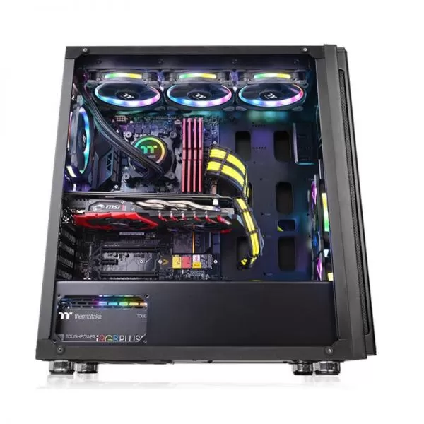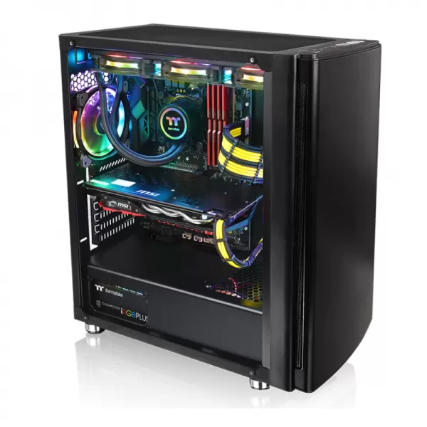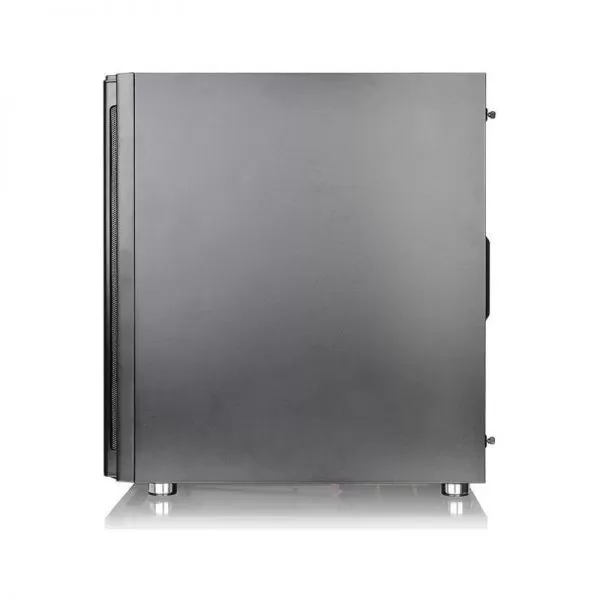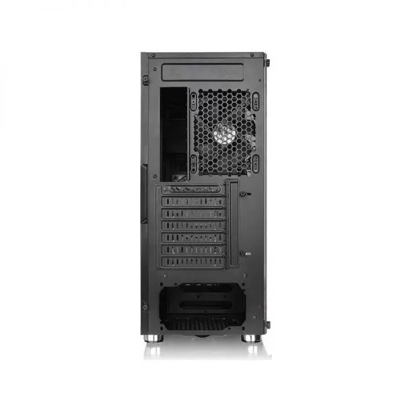 Thermaltake Versa H27 Tempered Glass Black, SPCC Steel ATX Mid Tower, fara sursa (tip ATX, montata jos), design premium cu panoul lateral din sticla securizata cu grosimea de 4mm, interior vopsit negru, 2x3.5”/2.5” (intern, ascunse), 3x 2.5” (intern, ascunse), fata – 3x 120mm fans (optional), spate – 1x 120mm fan (1000 RPM, 16 dBA, inclus), tavan – 3x 120mm / 2x 140mm fans (optional), 2x USB 3.0, 2x USB 2.0, HD Audio, ATX / microATX / Mini-ITX, sloturi expansiune: x7, inaltime maxima cooler procesor: 160mm, lungime maxima placa video: 310mm, lungime maxima sursa: 220mm, suport radiatoare water cooling: spate – 1 x 120mm, tavan – 1x 360mm / 1x 280mm, fata – 1x 360mm, dimensiuni (HxWxD): 493 x 219 x 469 mm, greutate: 7.1kg
