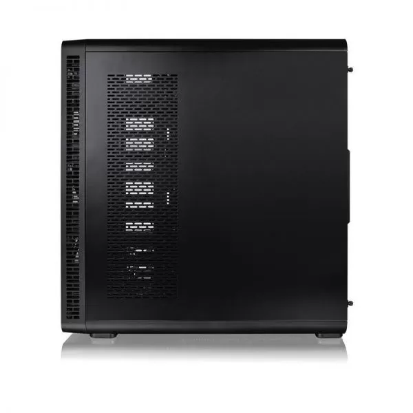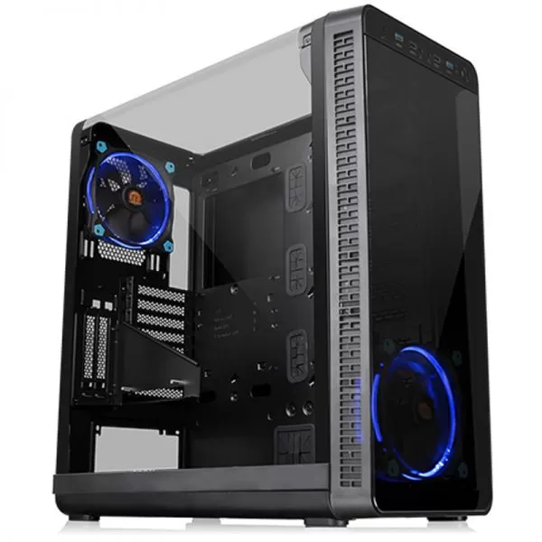 Thermaltake View 37 Window, SPCC Steel ATX Mid Tower, fara sursa (tip ATX, montata jos), interior vopsit negru, 3x3.5”/2.5” (intern), 8 x 2.5’’/4 x 3.5” (HDD Bracket), fata – 1x 140mm Riing Blue LED fan (1400rpm, 28dBA, inclus) / 3x 120/140mm fans (optional) / 1x 200mm fan (optional), spate – 1x 140mm Riing Blue LED fan (1400rpm, 28dBA, inclus) sau 1x 120mm fan (optional), podea – 1x 140/120mm fans (optional), interior partea dreapta – 3x 120mm/140mm fans (optional), 2x USB 3.0, 2x USB 2.0, HD Audio, E-ATX / ATX / microATX / Mini-ITX, sloturi expansiune: x8+2, posibilitatea montarii placii video in pozitie verticala (cablul Thermaltake PCI-e X16 Riser Cable nu este inclus), inaltime maxima cooler procesor: 180mm, lungime maxima placa video: 410mm (fara rack HDD), lungime maxima sursa: 220mm, suport radiatoare water cooling: fata – 1 x 360mm sau 1 x 280mm, interior dreapta – 1 x 360mm sau 1 x 420mm, spate – 1 x 120mm, dimensiuni (HxWxD): 525 x 261 x 538mm, greutate: 11.8kg