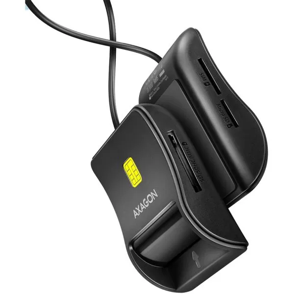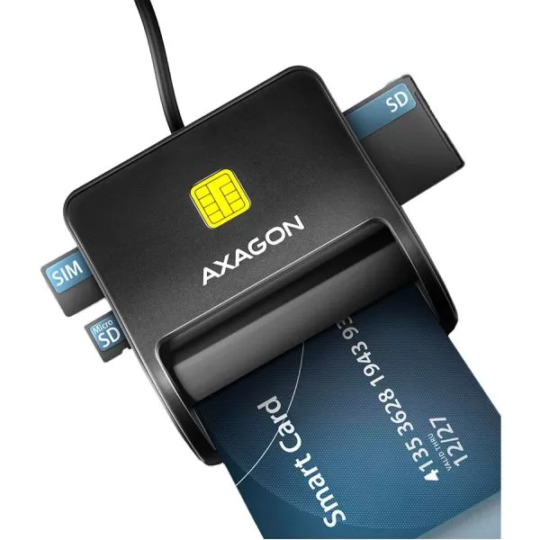 Axagon Cre-SM3SD FlatReader cu interfața USB 2.0 include sloturi suplimentare pentru carduri SD, microSD și SIM. Cititorul de carduri acceptă toate formatele de cărți inteligente de contact comun, cardurile de cip și alte carduri, inclusiv cardurile de plată a băncii de contact sau contactul cu cărți de identitate electronice *. Cititorul este compatibil cu majoritatea aplicațiilor naționale pentru EID (cărți de identitate electronice). Datorită slotului pentru card SIM, inclusiv software -ul SIM Management, SD și MicroSD Card slots, cititorul poate fi utilizat și pentru backup și transfer de date. Compatibilitatea cu toate sistemele de operare comune, cum ar fi Windows, Linux, Mac OS și Android, permite utilizarea pe scară largă pe desktop și laptopuri, precum și pe telefoane și tablete. Indicatorul LED inteligent se aprinde la scurt timp după schimbarea activității, apoi se oprește și nu deranjează utilizatorul cu lumină inutilă. Proiectarea compactă, fabricarea de înaltă calitate, plăcuțele anti-alunecare și cablul lung asigură o utilizare ușoară și fără probleme.