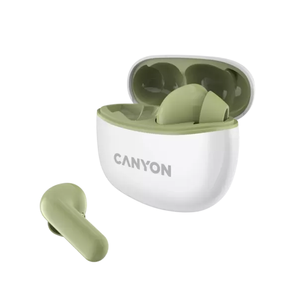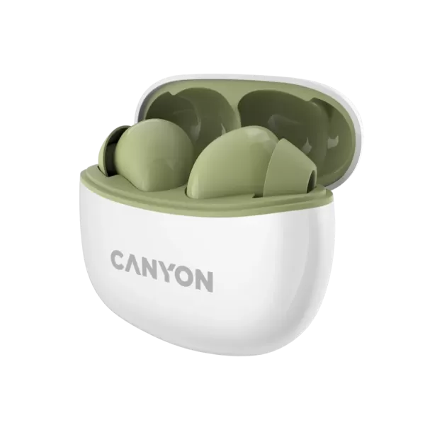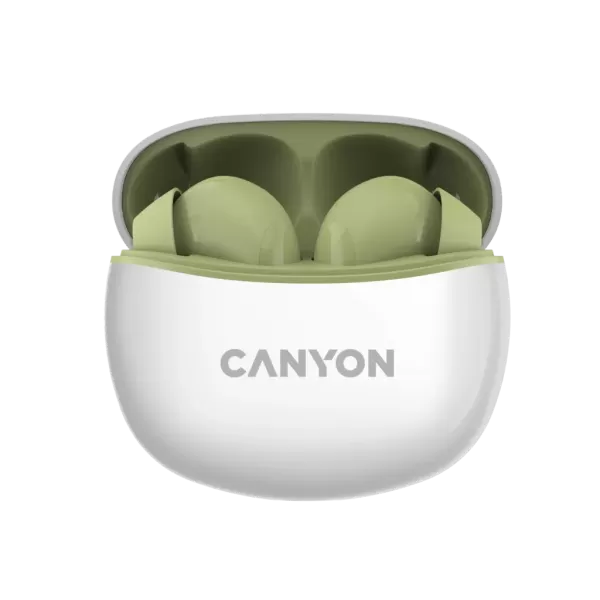 Canyon TWS-5 Bluetooth headset, with microphone, BT V5.3 JL 6983D4, Frequence Response:20Hz-20kHz, battery EarBud 40mAh*2+Charging Case 500mAh, type-C cable length 0.24m, Size: 58.5*52.91*25.5mm, 0.036kg, Green