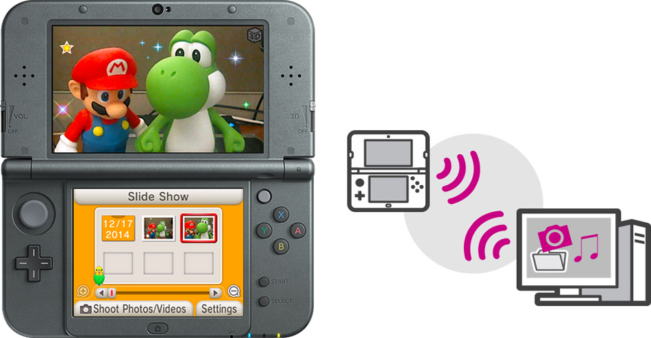 Poti transfera poze, muzica si alte fisiere intre calculator si consola cu ajutorului retelei wireless. Nu este nevoie sa scoti cardul micro SDHC.