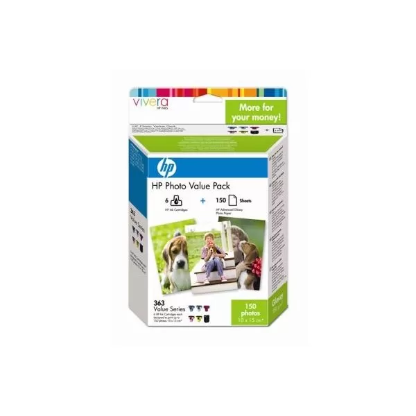Pachetul HP 363 Value foto combină convenabil 6 cartuşe cu cerneluri HP Vivera şi 150 de coli de hârtie foto HP de 10x15 cm, care vă permit să imprimaţi acasă, simplu şi rapid, fotografii cu aspect real, de calitate superioară[1].
