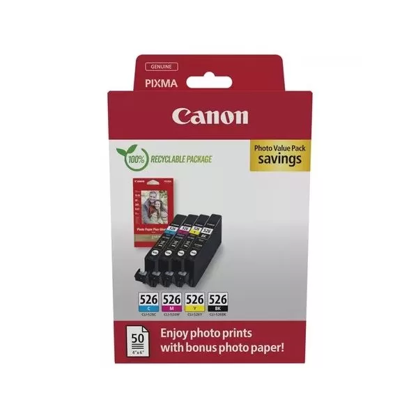 Pachet Cartuse Inkjet Canon CLI-526 B/C/M/Y + 50 coli hartie foto