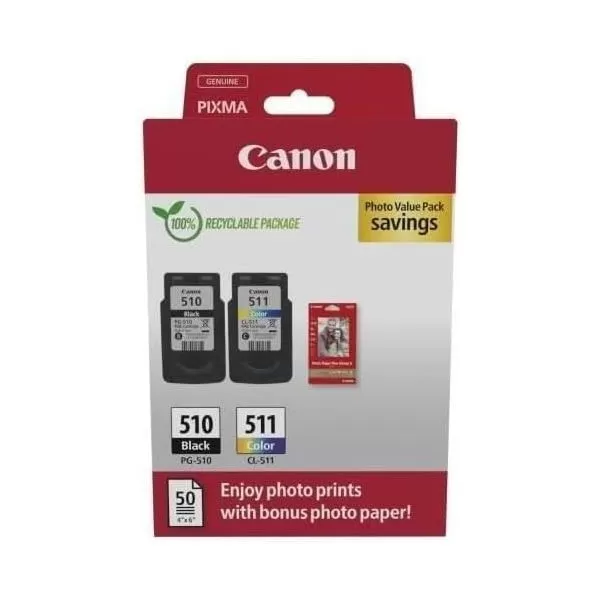 Canon pachet cartuse cearneala PG-510/CL-511 Photo value pack, capacitate negru: 9ml, Color: 9ml, Compatibil cu: PIXMA iP2700, PIXMA iP2702, PIXMA MP230, PIXMA MP240, PIXMA MP250, PIXMA MP252, PIXMA MP260, PIXMA MP270, PIXMA MP272, PIXMA MP280, PIXMA MP282, PIXMA MP480, PIXMA MP490, PIXMA MP492, PIXMA MP495, PIXMA MP499, PIXMA MX320, PIXMA MX330, PIXMA MX340, PIXMA MX350, PIXMA MX360, PIXMA MX410, PIXMA MX420, 50 coli foto 10x15cm.