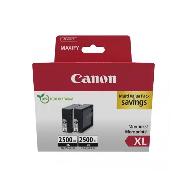CANON pachet cartuse cerneala PGI-2500XL BLACK 2-PACK, capacitate: 2x black (2500 pages, 70.9ml), Compatibilitate: MAXIFY iB4050, MAXIFY iB4150, MAXIFY MB5050, MAXIFY MB5150, MAXIFY MB5155, MAXIFY MB5350, MAXIFY MB5450, MAXIFY MB5455