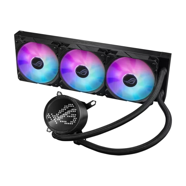 CPU COOLER ASUS ROG RYUO III 360 ARGB Water Block Water block dimention: 89 x 89 x 68.3 mm Block Material (CPU Plate): Copper Pump Pump Solution: 8th gen Asetek pump Motor Speed: 800 - 2,600 +/- 300 RPM Radiator Radiator Dimension: 399.5 x 120 x 30 mm Radiator Material: Aluminum Tube: Sleeved Rubber tube Tube Length: 400 mm Fan Fan: ROG FAN MODEL 12 ARGB - Size: 3 x Fan Slots (120mm) - Dimension: 120 x 120 x 25 mm - Speed: 2200 +/- 300 RPM - Static Pressure: 3.88 mmH2O - Air Flow: 70.07 CFM - Noise: 36.45 dB(A) - Control Mode: PWM/ DC Special Features Display: Anime Matrix LED AURA Sync Support: Yes Compatibility Intel: LGA 1700, 1200, 115x AMD: AM5,AM4