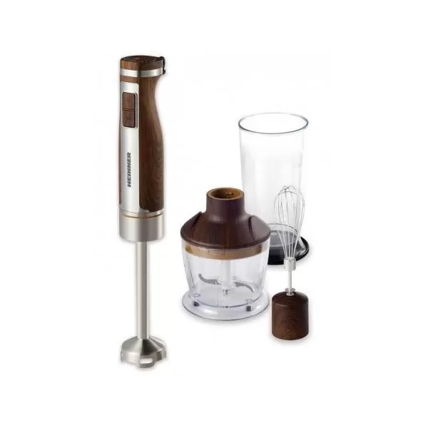 Blender de mana Heinner HHB-1100WX, putere nominala 700W, putere maxima 1100W, motor DC, viteza variabila, picior si lame din inox, Accesorii: tocator 500ml, cana de mixat 800ml, tel din inox, design din inox + lemn