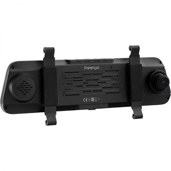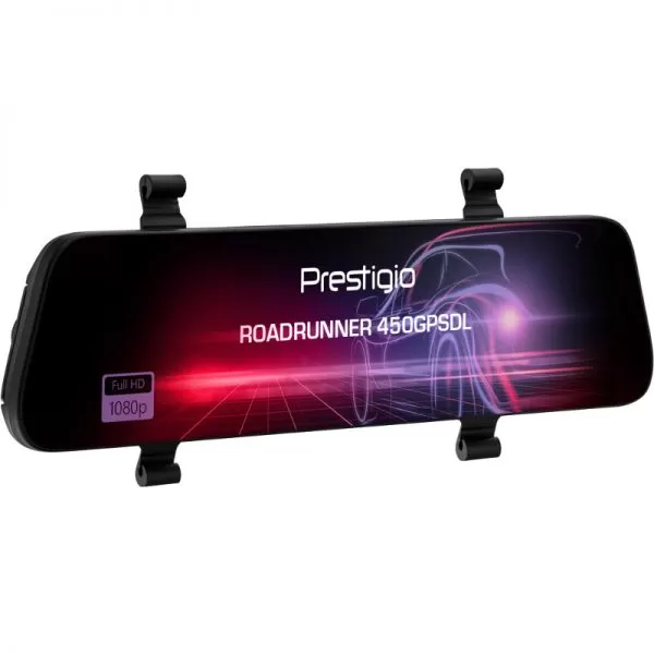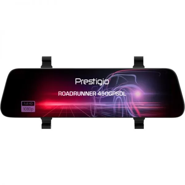 Prestigio RoadRunner 450GPSDL, 9.66'' IPS (1280x320) 2.5D curved touch display, Dual camera: front - FHD 1920x1080@30fps, HD 1280x720@30fps, rear - VGA 1920x1080@30fps, MSC8339D, 2 MP CMOS SC2363 front image sensor, 12 MP camera, 120° Viewing Angle, Mini USB, 800mAh battery, Voice Control, GPS tracker, Motion Detection, G-sensor, Cyclic Recording, color/Black, Plastic case