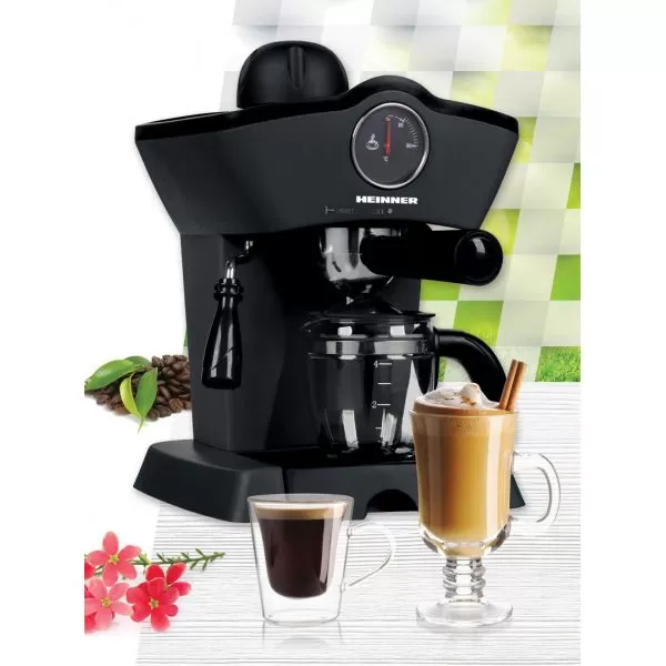 Espressor Heinner HEM-200BK,putere: 800 W, capacitate rezervor detasabil transparent : 250 ml, presiune pompa: 3.5 bar, termometru frontal pentru apa, optiuni preparare: espresso si cappuccino, tavita de scurgere detasabila, boiler din aliaj de aluminiu, filtru pentru 4 cesti de cafea, culoare: negru