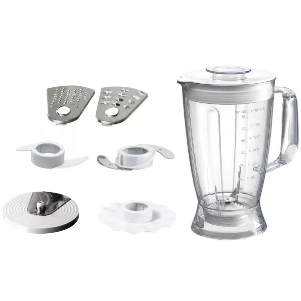 | Accesorii incluse: blender de 1.8L, accesorii pentru razuire si feliere, accesorii pentru tocare si framantare, disc pentru unt Setul de accesorii extinde posibilitatile de utilizare ale aparatului, astfel ca poti pregati mancare si prajituri deopotriva, poti razui, taia, amesteca sau framanta complet ingredientele, pentru a obtine acele preparate gustoase care ii vor bucura pe cei dragi. Blenderul cu o capacitate de 1.8L este perfect pentru smoothie-uri sau supe creme. |
