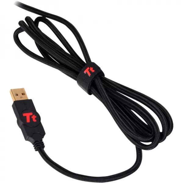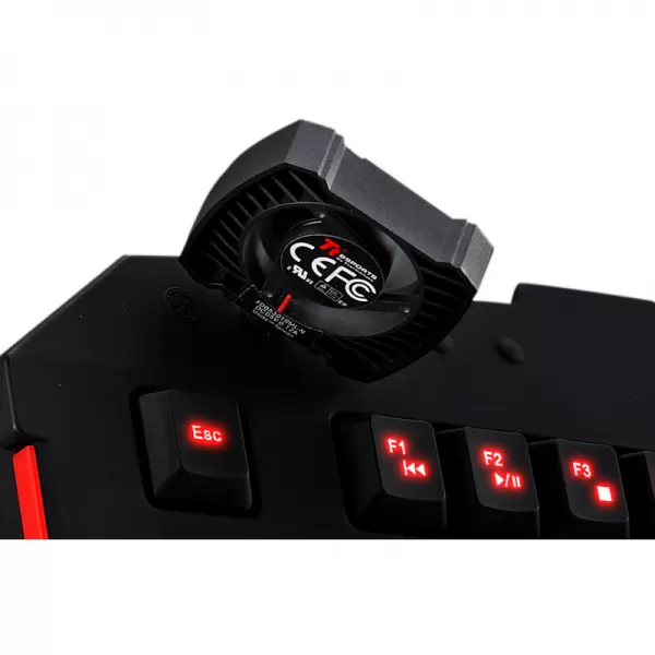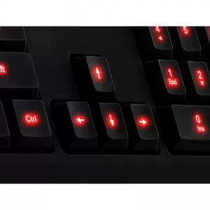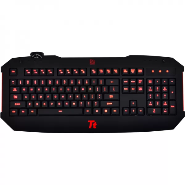 Tt eSPORTS CHALLENGER Illuminated, iluminare LED rosie a tastelor cu 4 nivele de intensitate, 32KB memorie on-board, port USB 2.0 pentru periferice, software pentru configurare (posibilitatea setarii de 3 profile, posibilitatea salvarii profilelor in memoria tastaturii, profilele por fi schimbate direct de pe tastatura), 6 taste macro, 7 taste multimedia, sistem de cable management, ventilator pentru racirea mainilor, taste dummy pentru butoanele Windows pentru a preveni apasarea accidentala, dimensiuni: 480 x 205 x 25mm, lungime cablu: 2m, conector USB placat cu aur, USB