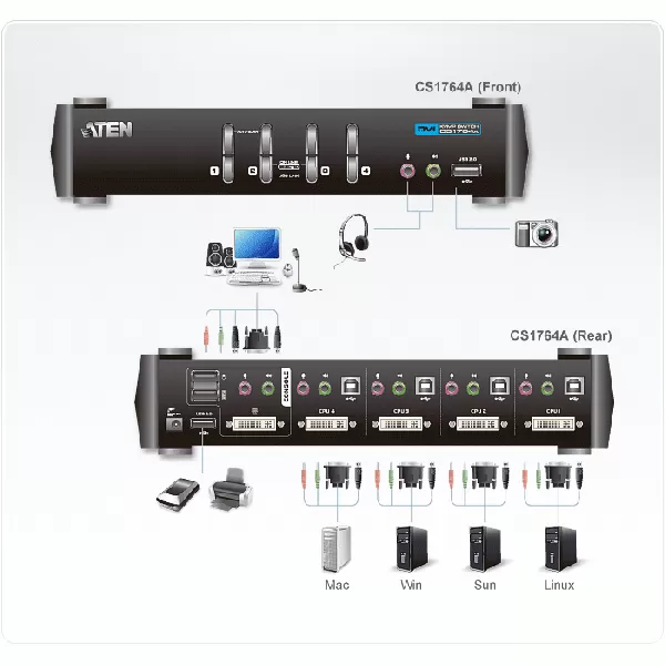 | Nume produs | ATEN CS1764A 4-Port DVI USB 2.0 KVMP Switch, 4x DVI-D Cables, 2-port Hub, Audio |