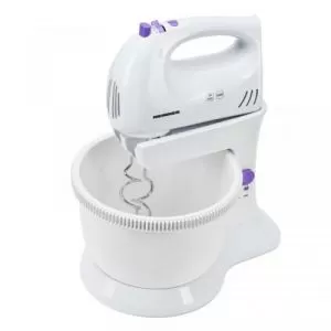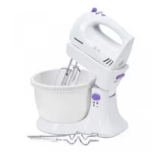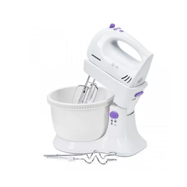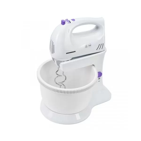 Mixer cu bol Heinner HMB-350UV, putere: 300W, 5 viteze+turbo, bol rotativ: 2.5 l, accesorii din inox: 2 teluri + 2 carlige pentru framantare, buton ejector cu dispozitiv de siguranta, buton eliberare mixer de mana, culoare: ultraviolet