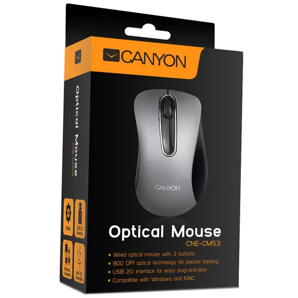 CANYON Mouse CNE-CMS3 (Wired, Optical 800 dpi, 3 btn, USB), Silver