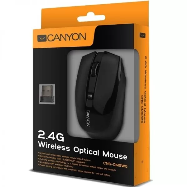 Mouse Canyon CNS-CMSW5 (Wireless, Optical 800/1280 dpi, 4 btn, USB, power saving technology), Black