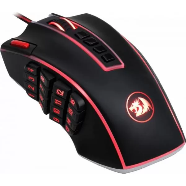 Redragon Legend, 16400 DPI, 12000 FPS, acceleratie 30G, 12000FPS, polling rate: 1000/500/250/125Hz, sasiu din aluminiu, senzor laser Avago, micro switch-uri Omron (durata de viata: 5 milioana click-uri), numar butoane: 24 (22 programabile), 5 moduri de iluminare (16 milioana de culori disponibile), include program pentru configurare (macro-uri, profile, mod iluminare, etc.), picioruse de teflon, conector USB placat cu aur, lungime cablu: 1.8m, dimensiuni: 126x79x37mm, greutate: 190g (incluzand greutati 2.4g x 8 bucati), USB