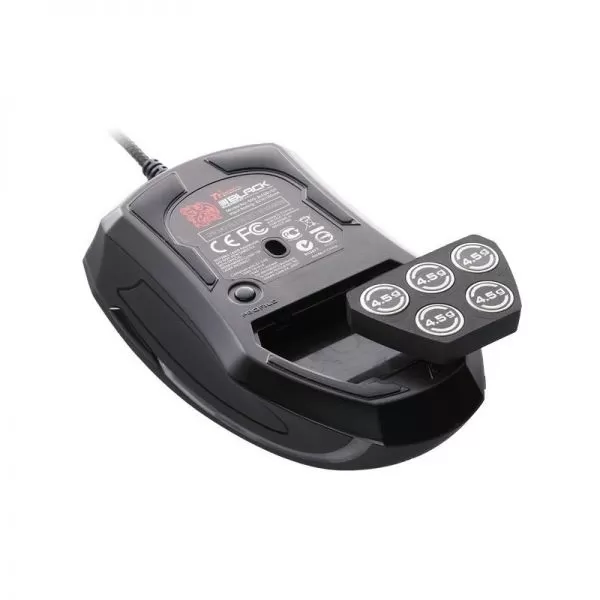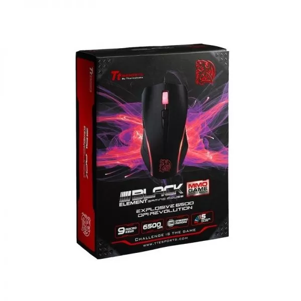 Tt eSPORTS BLACK element, 100-6500 DPI, senzor laser, posibilitatea schimbarii culorii care ilumineaza mouse-ul (5 culori disponibile), 128kb memorie on-board (5 profile, 9 taste macro, salvarea setarilor), switch-uri Omron, greutati: 4.5g x5, lungime cablu: 1.8m, picioare de teflon, conector USB placat cu aur, dimensiuni: 123.8 x 66.7 x 41.6mm, USB