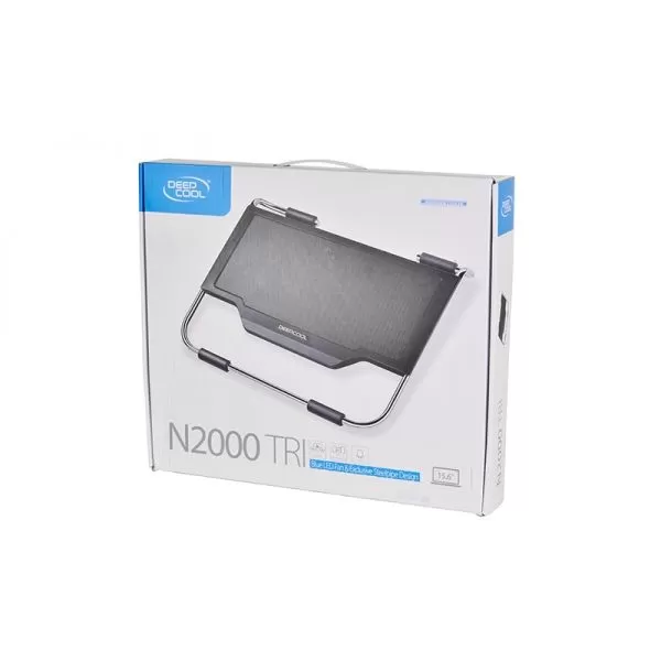 Deepcool N2000 TRI Black, structura din mesh metalic, otel si plastic, dimensiune notebook: 15.6” (maxim), trei ventilatoare: 1x 120x120x25mm (1000 RPM), 2x 70x70x15mm (2000 RPM), flux de aer: 74.35 CFM, nivel zgomot: 23 dBA, 2 porturi USB, iluminare LED, design anti-alunecare, dimensiuni: 339x312x54mm