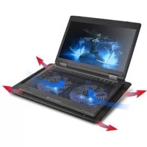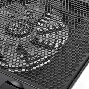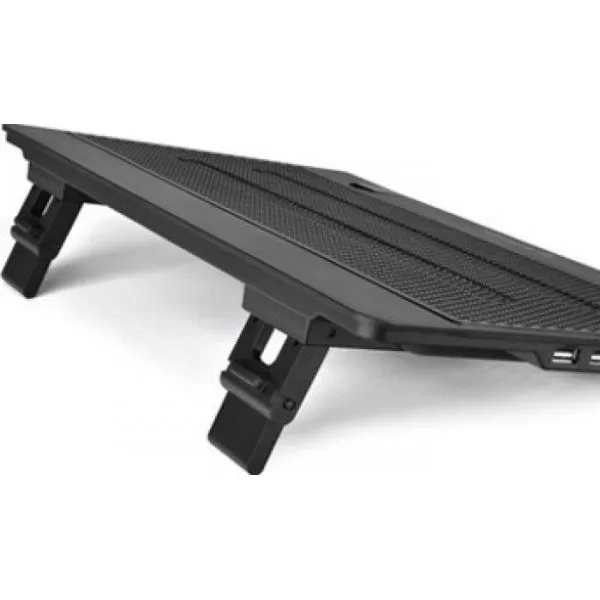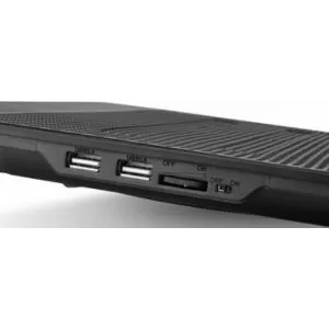 Thermaltake Massive 14², structura din plastic si mesh metalic, dimensiune notebook: 10” - 17” (maxim), doua ventilatoare silentioase de 140mm (700-1200 RPM, 58.97 CFM, max 22.1 dBA, 1.01 mm-H2O, control turatie ventilator, buton ON/OFF pentru LED-urile ventilatorului), 2 porturi USB incluse, trei unghiuri de inclinare, alimentare de la portul USB, dimensiuni: 382 x 262 x 26 mm, greutate: 663g