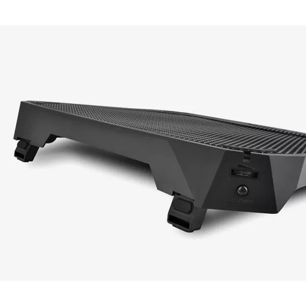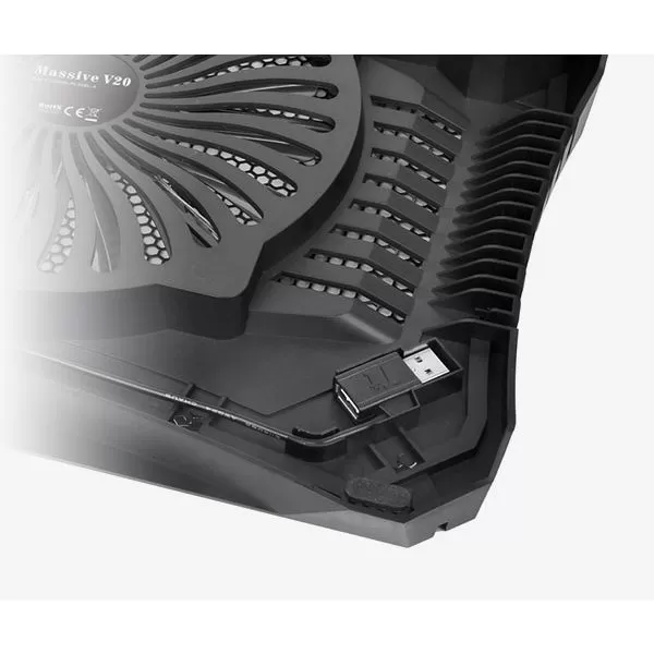 Thermaltake Massive V20, structura din plastic si mesh metalic, dimensiune notebook: 10” - 17” (maxim), ventilator silentios de 200mm (600-800 RPM, 70.38 CFM, max 31.7 dBA, control turatie ventilator, buton ON/OFF pentru LED-urile ventilatorului), doua unghiuri de inclinare, alimentare de la portul USB, dimensiuni: 365 x 276 x 42 mm, greutate: 700g
