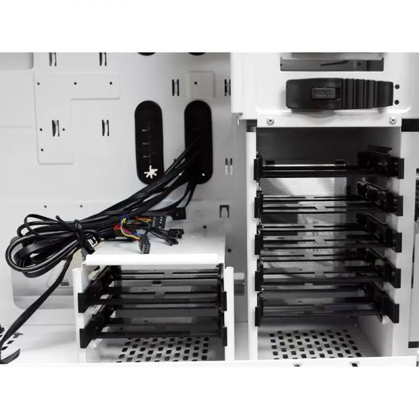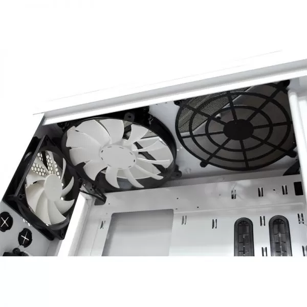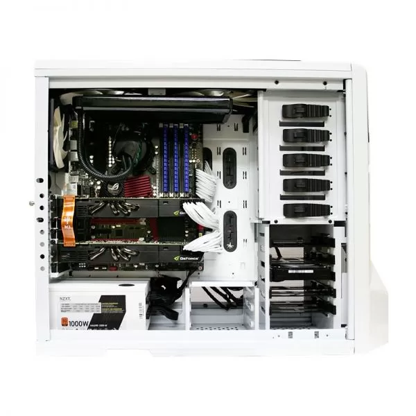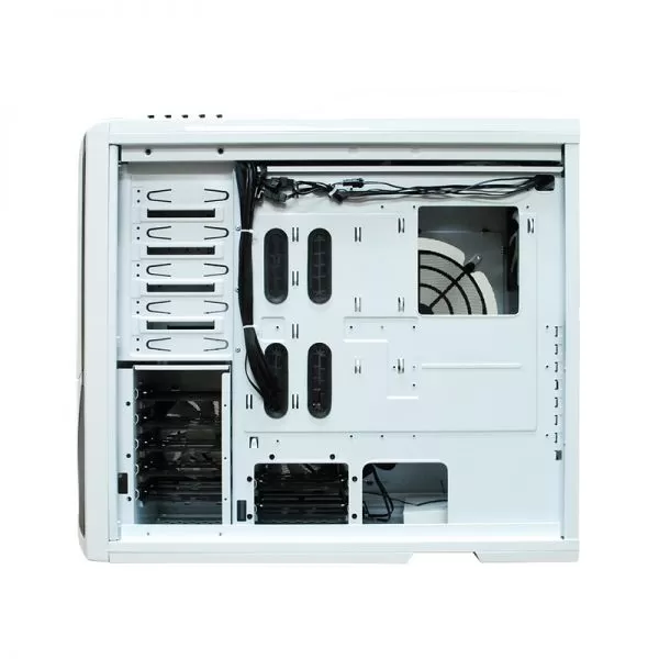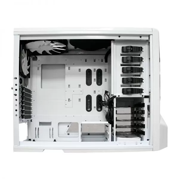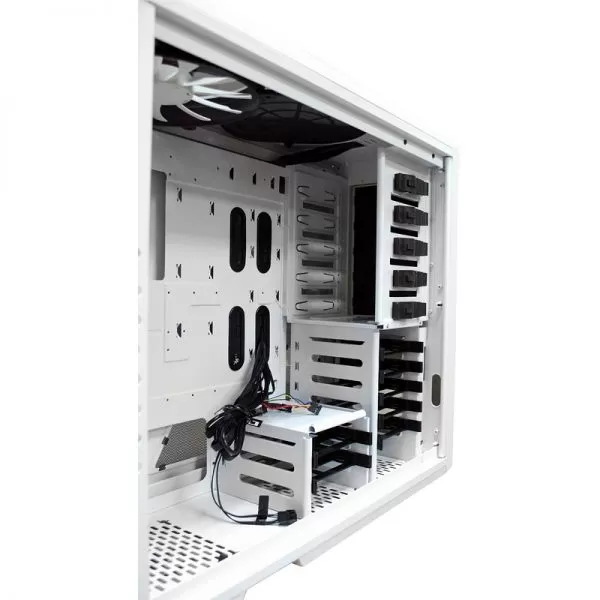 NZXT Phantom White, SECC Steel EATX Full Tower, fara sursa, interior vopsit alb, 5x5.25” (extern), 7x3.5”/2.5” (intern), design tool-less, fan controller cu 5 canale (20W/canal), spate – 1x 120mm fan (inclus), fata – 1x 140mm fan (optional), lateral – 2x 120mm fans (inclus) si 1x 230/200mm fan (optional), tavan – 1x 200mm LED fan (inclus) si 1x 200mm fan (optional), 1x USB 3.0, 1x USB 2.0, 1x eSATA, 1x Audio/Mic, EATX / ATX / microATX, sloturi expansiune: x7, inaltime maxima cooler procesor: 170mm, lungime maxima placa video: 350mm, filtre de praf incluse, dimensiuni: 222 x 540 x 623mm, greutate: 11kg